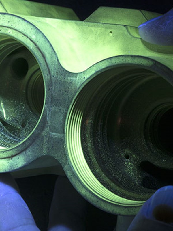 Fluorescent Liquid Penetrant Inspection is appropriate for finding discontinuities that are open to the surface, such as seams, porosity, shrinkage, weldment flaws, cracks and more. It is a popular method of testing, due in part, to its low cost. It too can be used on wide array of materials, as well as different sizes and shapes. The fluorescent dyes used are capable of entering minute defects that would not normally be detectable by the human eye.